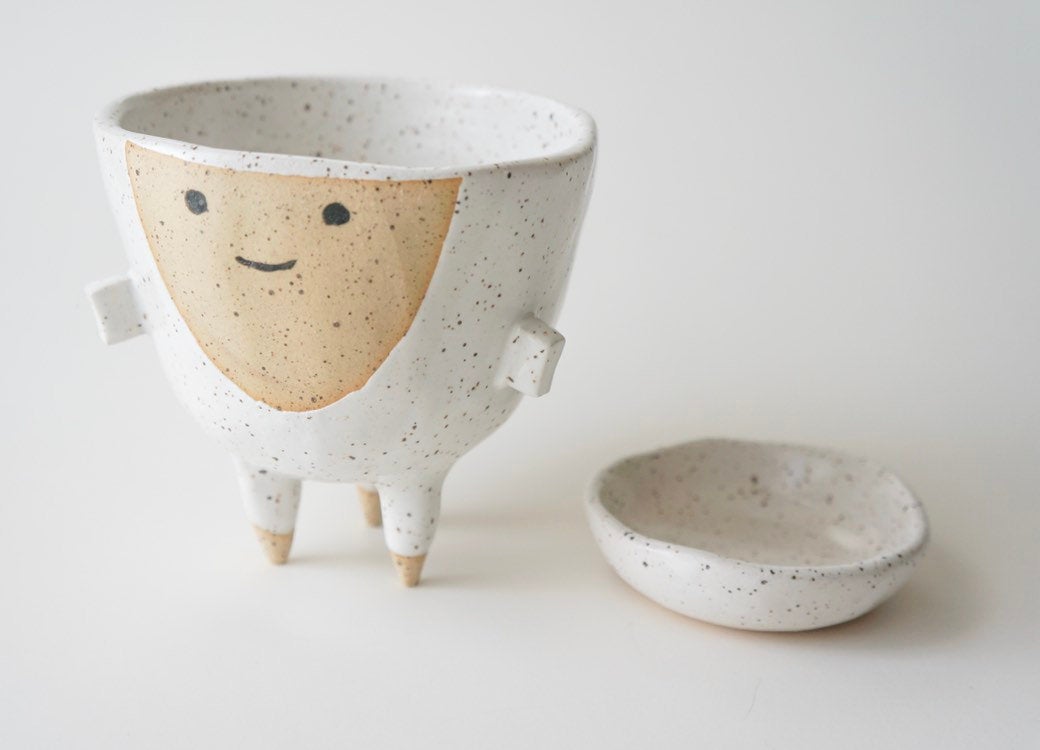 Hand formed out of speckled stoneware clay sheets & dipped in white satin glaze, burned to high temperature.